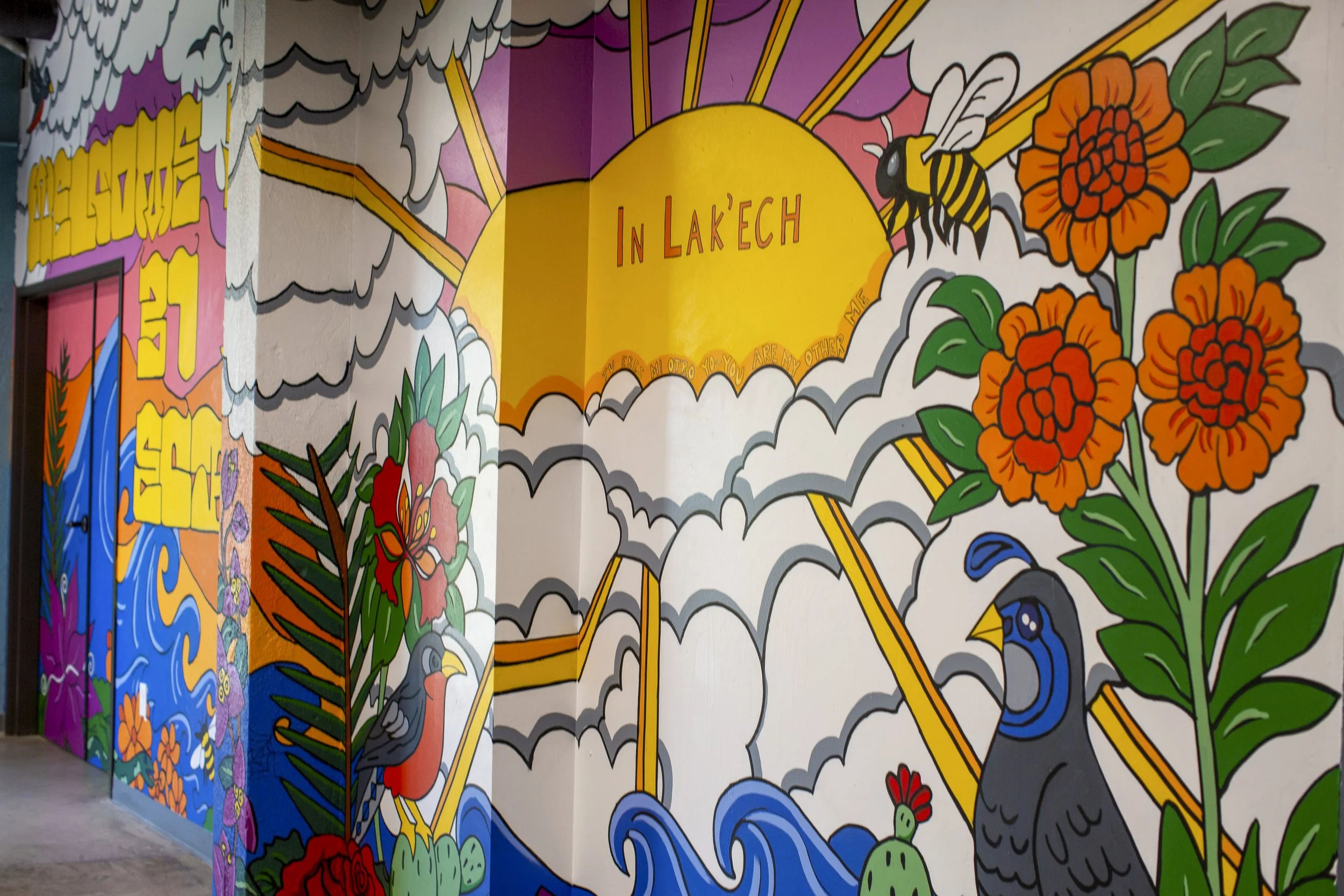 Every detail on the mural, from the soccer jersey and rainbow to the birds flying with the sun and moon, connects students of different ages and backgrounds. By including local landmarks, like our home at ARTS, these students showed that 'home' is not just a place. It is also the beauty you help create for others.