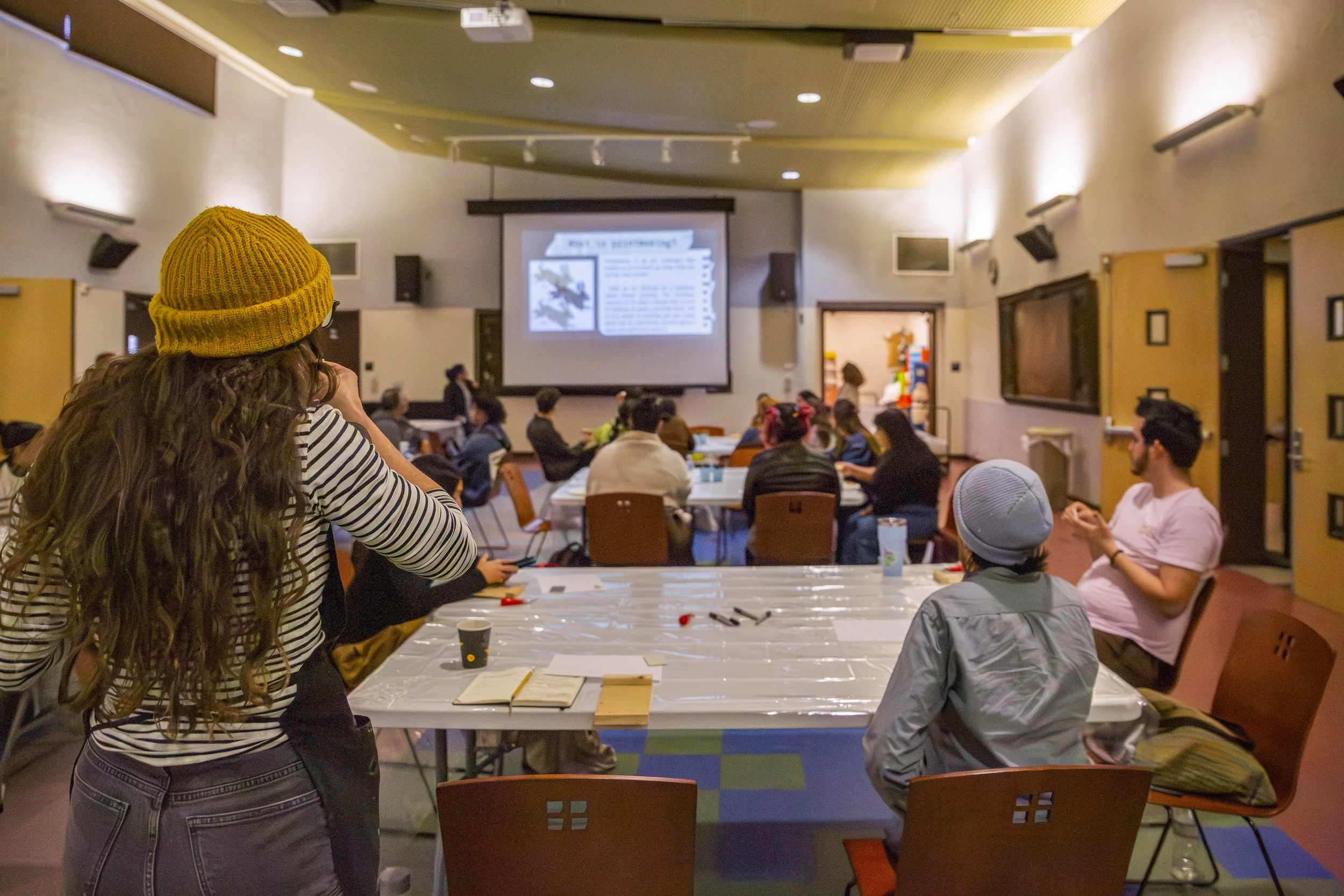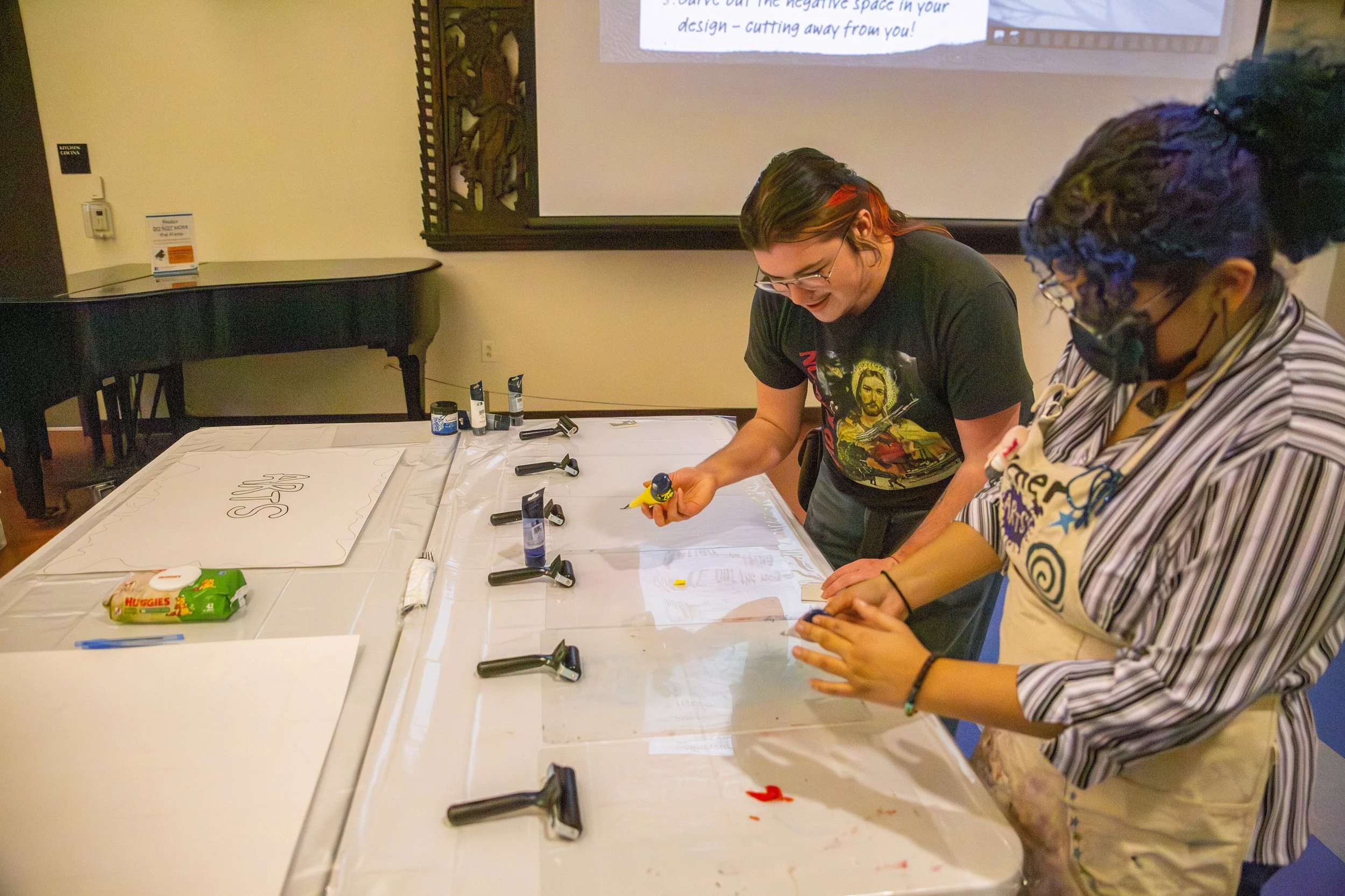 Teaching Artists Ever Rose and Isabella Cervantes led a hands-on linocut project, inviting everyone to show what collective care means to them through art. Each team member made a stamp to represent care in their community. This creative process led to meaningful conversations about how we support each other. At the end, everyone added their stamp to a collaborative art piece that will be displayed at our Youth Arts Festival in May.