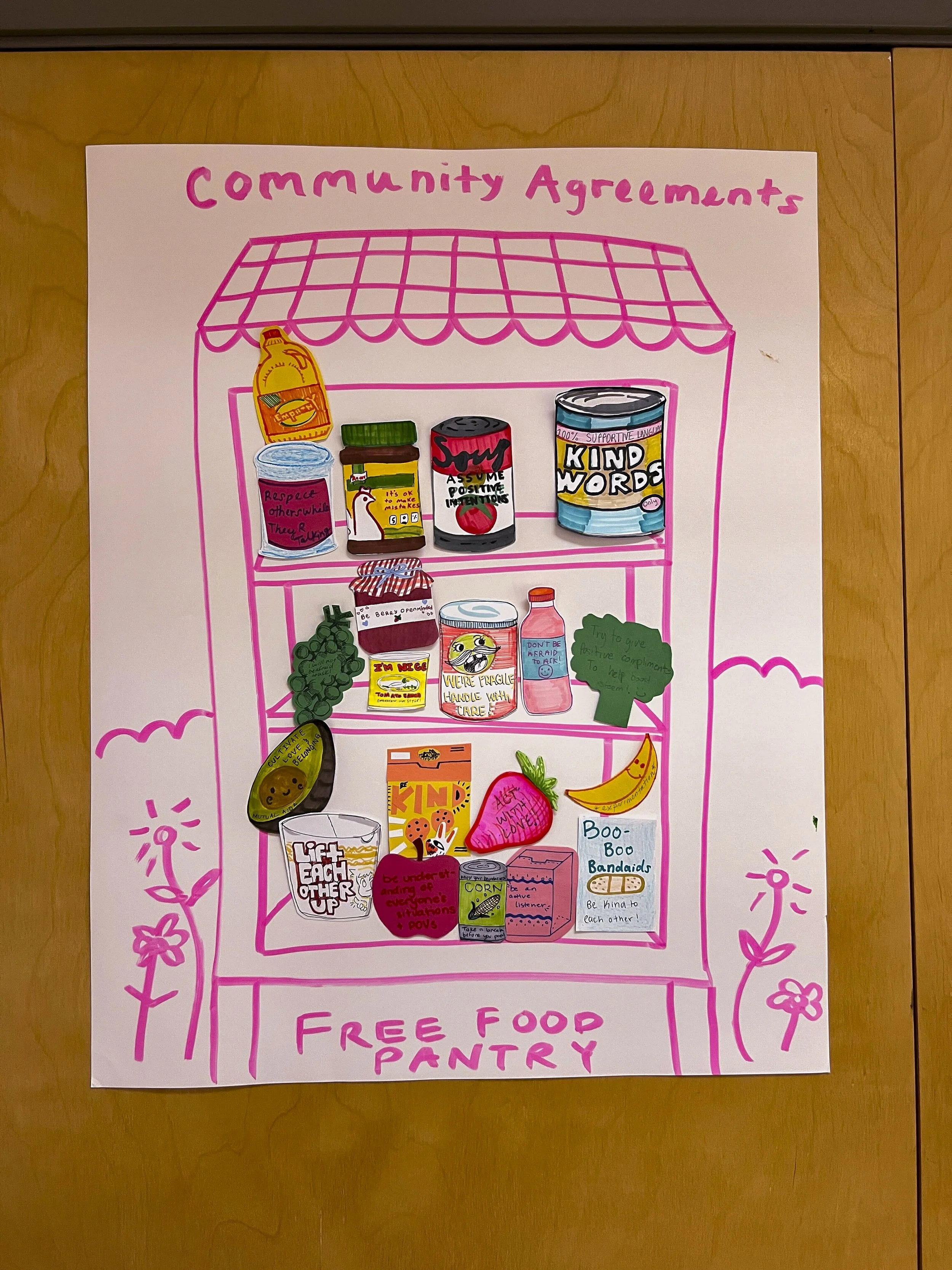 Throughout the day, we looked for ways to share this idea with the youth in our programs. One example was the “Free Food Fridge” Community Agreements activity, which our ARTS on Campus team participated in last week, which was inspired by the One Love Community Fridge Project in New York and was presented by AoC Teaching Artist Zadé Helena, this activity taught the idea of ‘mutual aid’ in a creative and effective way. “Art-making connects agreements to practical, creative practice: food objects + care agreements = rehearsal for empathy.”